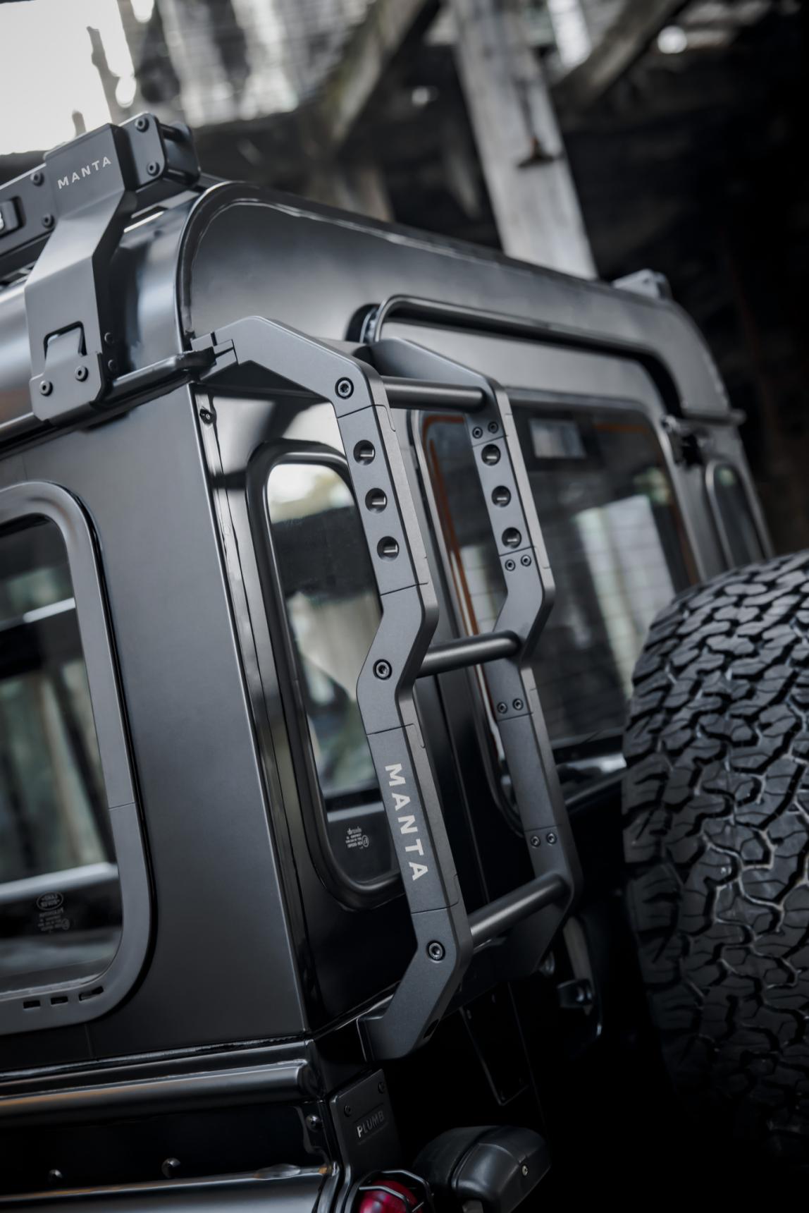 爬梯,在这里单独介绍一下:每一位越野爱好者都深知爬梯对车辆功能和安全性带来的重要作用,同时还能与车顶平台联动,提升储物与作业的效率。“稳定、耐用”是对爬梯的基本要求,MANTA老卫士量版定制系列这款爬梯,采用铝镁合金材质,既加强了爬梯的坚固性,又具有轻量化特点,将大大减轻车辆的承载负担,外观设计也是非常契合原厂风格。