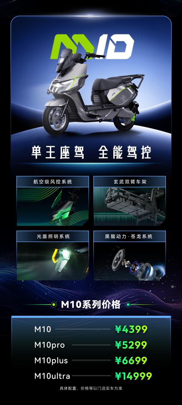 专为外卖骑手打造的M10,凭借机能美学设计诠释装甲型格,搭载的玄武双臂车架采用上下双层双臂围栏结构,历经200万次炼狱级震动测试,兼具结构稳定、工艺精湛、能量强劲三大优势。动力方面,黑龍动力苍龙系统输出5600W峰值功率,极速可达90km/h,让送餐效率再升一级,轻松实现“快人一步”。安全配置上,M10堪称行业标杆:双通道ABS、智能TCS、汽车级毫米波雷达、胎压监测等配置一应俱全,全方位保障骑行安全。同时,航空级风控系统与光盾照明系统的加持,进一步提升出行体验。