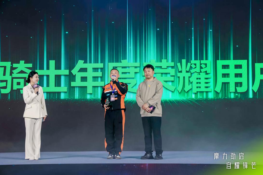 在黑骑士的理念中,用户从不只是单纯的消费者,更是并肩前行的“体验官”“共创者”与“合伙人”。为感谢一路相伴的“黑粉”与老友们,发布会现场创始人于坤亲自颁发了“最佳活跃用户奖”“风旅骑士团最佳新人奖”“铁哥们用户奖”等多个奖项。其中,狼队张宝剑分享的与黑骑士在公益之路上的暖心故事,传递出满满爱与能量,赢得全场阵阵掌声。
